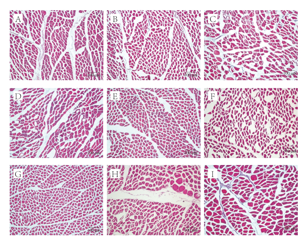 用手术刀取肉样中央部位,分割为2 cm×1 cm×1 cm的肉块,并将样品置于10%福尔马林溶液中固定,经修块、浸洗后依次用体积分数50%、70%、80%、90%、95%乙醇溶液及无水乙醇进行梯度脱水处理;再依次浸入二甲苯与无水乙醇体积比1∶1的混合溶液、二甲苯中进行透明处理。将透明后的肌肉组织在恒温培养箱中依次经过熔点分别为54~56、56~58、58~60 ℃的石蜡,再用60 ℃石蜡进行包埋;经过冷却修整后用切片机连续切片,厚度5 μm,经过展片、粘片,贴于载玻片上,制备石蜡切片。石蜡切片用二甲苯脱蜡后用乙醇洗脱,然后用苏木素染色3~5 min,用蒸馏水冲洗多余染料后,在盐酸-乙醇溶液中分化5~10 s(如果胞浆无明显着色,可以不分化);自来水浸泡一段时间后用氨水返蓝30 s;再置于伊红染色液中染色2 min,自来水冲洗终止;再进行常规的脱水、透明后用中性树脂封片。用倒置显微镜观察切片并拍照,并用Image-Pro Plus 6.0软件测定单条肌纤维面积、直径及密度。