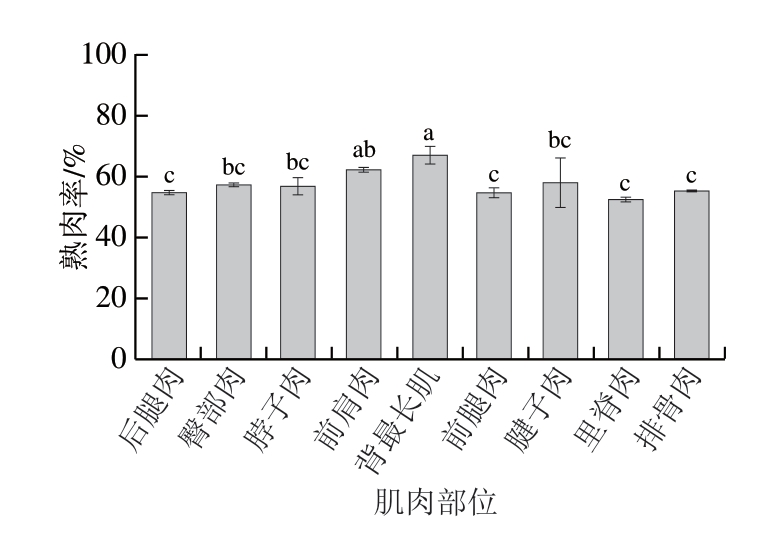 熟肉率是衡量肌肉蒸煮损失程度的指标,肌肉的蒸煮损失越小,熟肉率越高,出品率越高,表明肉具有较好的加工品质[28]。由图5可知,新疆双峰驼不同部位肉的熟肉率由大到小依次为:背最长肌>前肩肉>排骨肉>臀部肉>腱子肉>脖子肉>里脊肉>后腿肉>前腿肉。新疆双峰驼背最长肌熟肉率最高,达到67.09%,其次是前肩肉,为62.26%,且两者无显著差异,表明背最长肌和前肩肉的出品率较高,可能适用于加工蒸煮类和酱卤类肉制品。而前腿肉熟肉率最低,为52.46%,可能与其系水力较低有关,导致蒸煮损失较大。一般来说,蒸煮损失较大的部位肉不适用于酱卤类产品的加工。新疆双峰骆驼肉的平均熟肉率为57.57%,其平均蒸煮损失高于阿曼阿拉伯单峰骆驼,但背最长肌的蒸煮损失结果相似[29];熟肉率相较于闫睛等[30]对伊犁马肉的研究结果略低,可能与前述讨论中新疆双峰骆驼肉的保水性相较于马肉略差有关。