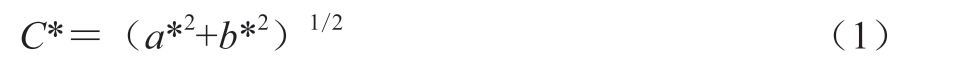 参照Alonso等[9]的方法,使用色差计测定。将骆驼肉在空气中暴露30 min,用色差计测定骆驼肉表面亮度值(L*)、红度值(a*)和黄度值(b*)。色差计使用前用黑板和白板校准,选择光源D65,观察者角度10°。L*=100为白,L*=0为暗;a*>0表示颜色偏红,a*越大,表示颜色越红;b*>0表示颜色偏黄,b*越大,表示肉色越偏黄,b*<0表示颜色偏蓝。色度值(C*)按式(1)计算,C*越高表示颜色越鲜艳。