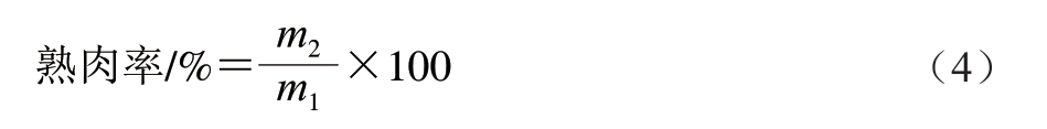 取骆驼肉约50 g,准确称质量(m1,g),置于水浴锅中蒸煮45 min,采用探针式温度计测定肉块中心温度,煮制至中心温度达到90 ℃,取出冷却至室温,吸干表面水分,再次称质量(m2,g)。熟肉率按式(4)计算。
