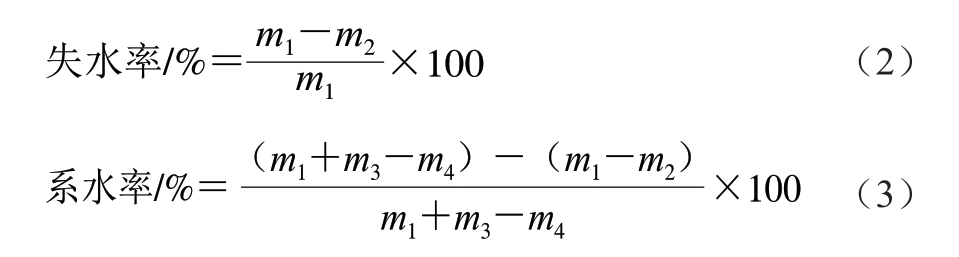 精确称取3~4 g肉样(m1,g),在上下各垫5 层滤纸,在35 kg压力下保持5 min,取出肉样称质量(m2,g)。将称量瓶放入恒温干燥箱中干燥至恒质量(m3,g)后,将前述加压后的肉样放入称量瓶中,置于105 ℃恒温干燥箱中烘烤2 h后取出,置于干燥器中冷却30 min后称质量,再放入恒温干燥箱中干燥,重复上述工和,直至2 次称量结果之差小于2 mg为止,样品最终质量记为m4(g)。失水率和系水力分别按式(2)~(3)计算。