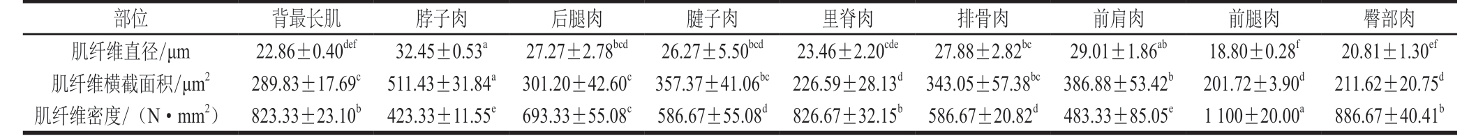 部位 背最长肌 脖子肉 后腿肉 腱子肉 里脊肉 排骨肉 前肩肉 前腿肉 臀部肉肌纤维直径/μm 22.86±0.40def 32.45±0.53a 27.27±2.78bcd 26.27±5.50bcd 23.46±2.20cde 27.88±2.82bc 29.01±1.86ab 18.80±0.28f 20.81±1.30ef肌纤维横截面积/μm2 289.83±17.69c 511.43±31.84a 301.20±42.60c 357.37±41.06bc 226.59±28.13d 343.05±57.38bc 386.88±53.42b 201.72±3.90d 211.62±20.75d肌纤维密度/(N·mm2) 823.33±23.10b 423.33±11.55e 693.33±55.08c 586.67±55.08d 826.67±32.15b 586.67±20.82d 483.33±85.05e 1 100±20.00a 886.67±40.41b