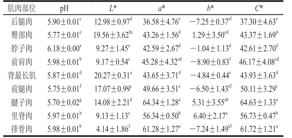 肌肉部位 pH L* a* b* C*后腿肉 5.90±0.01c 12.98±0.97d 36.58±4.76e -7.25±0.37ef 37.30±4.63e臀部肉 5.77±0.01e 19.56±3.62bc 43.26±1.56d 1.29±3.50cd 43.37±1.69d脖子肉 6.18±0.00a 9.27±1.45e 42.59±2.67d -1.04±1.13d 42.61±2.70d前肩肉 5.98±0.01b 9.17±0.54e 45.28±4.32cd -8.90±0.83f 46.17±4.08cd背最长肌 5.87±0.01d 20.27±0.31a 43.65±3.71d -4.84±0.44e 43.93±3.63d前腿肉 5.75±0.01f 17.07±0.99c 49.66±3.51c -6.50±1.43ef 50.11±3.29c腱子肉 5.70±0.02g 14.08±2.21d 64.34±1.28a 5.31±3.55ab 64.63±1.33a里脊肉 5.97±0.01b 9.13±1.13e 56.34±0.50b 6.40±2.17a 56.73±0.47b排骨肉 5.98±0.01b 4.14±1.86f 61.28±1.27a -7.24±1.49ef 61.72±1.21a