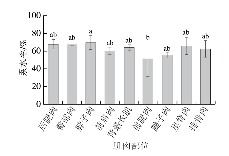 肌肉蛋白与水的结合能力是影响宰后肉品质的重要因素,对后续加工和贮藏过程中肉的嫩度、多汁性、风味及营养成分等食用品质有直接影响,常用失水率和系水力等指标衡量。失水率和系水力一般呈负相关,失水率越高,肌肉水分越易渗出,持水性越差,造成可溶性营养成分和风味随着渗出的水分流失[22]。由图2可知,新疆双峰骆驼肉失水率介于17.04%~28.74%之间,不同部位驼肉失水率由大到小依次为:腱子肉>前腿肉>前肩肉>排骨肉>里脊肉>背最长肌>后腿肉>臀部肉>脖子肉;经方差分析可知,腱子肉失水率显著高于臀部肉、脖子肉(P<0.05),其他部位肉间均无显著差异。由图3可知,新疆双峰骆驼肉系水力介于51.30%~69.53%之间,不同部位肉系水力由大到小依次为:脖子肉>臀部肉>后腿肉>里脊肉>背最长肌>排骨肉>前肩肉>腱子肉>前腿肉;经方差分析可知,脖子肉与前腿肉的系水力存在显著差异(P<0.05),其他部位肉间系水力没有显著差异。新疆双峰骆驼肉失水率和系水力的平均值分别为22.33%和62.82%,其保水性相较于阿拉善双峰骆驼肉(17.55%、76.28%)和伊犁马肉(6.39%、91.41%)稍差[23-24]。脖子肉和臀部肉具有较低的失水率和较高的系水力,保水性最好,适用于蒸煮类、酱卤类肉制品的开发;而腱子肉和前腿肉的保水性较差,可能适用于加工干制类肉产品。