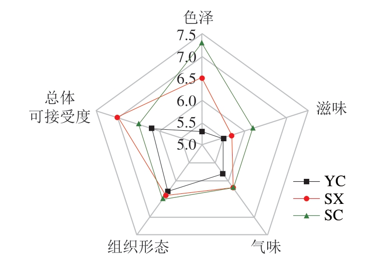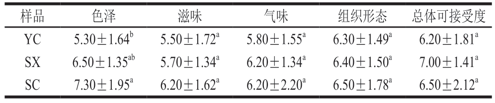 样品色泽滋味气味组织形态总体可接受度YC5.30±1.64b5.50±1.72a5.80±1.55a6.30±1.49a6.20±1.81a SX6.50±1.35ab5.70±1.34a6.20±1.34a6.40±1.50a7.00±1.41a SC7.30±1.95a6.20±1.62a6.20±2.20a6.50±1.78a6.50±2.12a