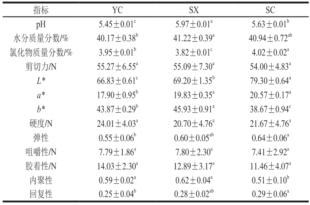 指标YCSXSC pH5.45±0.01c5.97±0.01a5.63±0.01b水分质量分数/%40.17±0.38b41.22±0.39a40.94±0.72ab氯化物质量分数/%3.95±0.01b3.82±0.01c4.02±0.02a剪切力/N55.27±6.55a55.09±7.30a54.00±4.83a L*66.83±0.61c69.20±1.35b79.30±0.64a a*17.90±0.95b19.83±0.35a20.57±0.17a b*43.87±0.29b45.93±0.91a38.67±0.94c硬度/N24.01±4.03a20.70±4.76a 21.67±4.76a弹性0.55±0.06b0.60±0.05ab0.64±0.06a咀嚼性/N7.79±1.86a7.80±2.30a7.41±2.92a胶着性/N14.03±2.30a 12.89±3.17a 11.46±4.07a内聚性0.59±0.02a0.62±0.04a0.51±0.10b回复性0.25±0.04b0.28±0.02ab0.29±0.06a