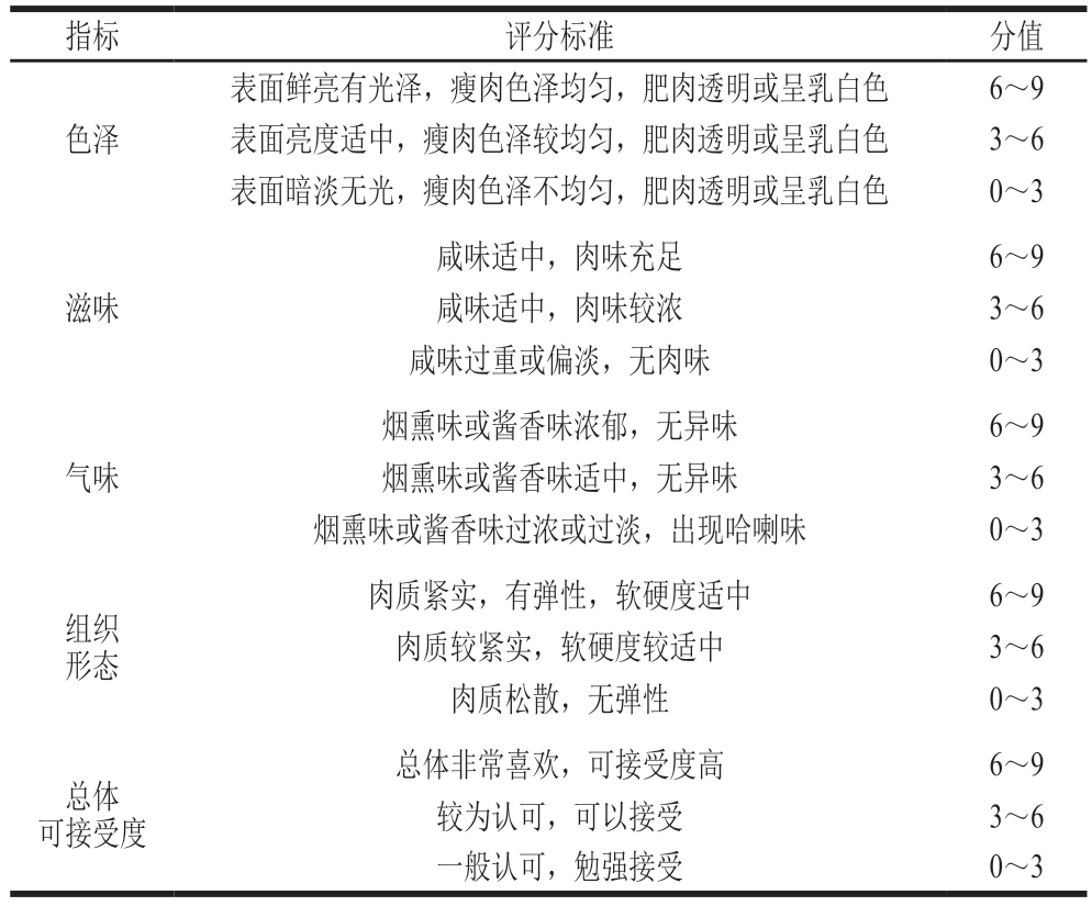 指标评分标准分值色泽表面鲜亮有光泽,瘦肉色泽均匀,肥肉透明或呈乳白色6~9表面亮度适中,瘦肉色泽较均匀,肥肉透明或呈乳白色3~6表面暗淡无光,瘦肉色泽不均匀,肥肉透明或呈乳白色0~3滋味咸味适中,肉味充足6~9咸味适中,肉味较浓3~6咸味过重或偏淡,无肉味0~3气味烟熏味或酱香味浓郁,无异味6~9烟熏味或酱香味适中,无异味3~6烟熏味或酱香味过浓或过淡,出现哈喇味0~3组织形态肉质紧实,有弹性,软硬度适中6~9肉质较紧实,软硬度较适中3~6肉质松散,无弹性0~3总体可接受度总体非常喜欢,可接受度高6~9较为认可,可以接受3~6一般认可,勉强接受0~3