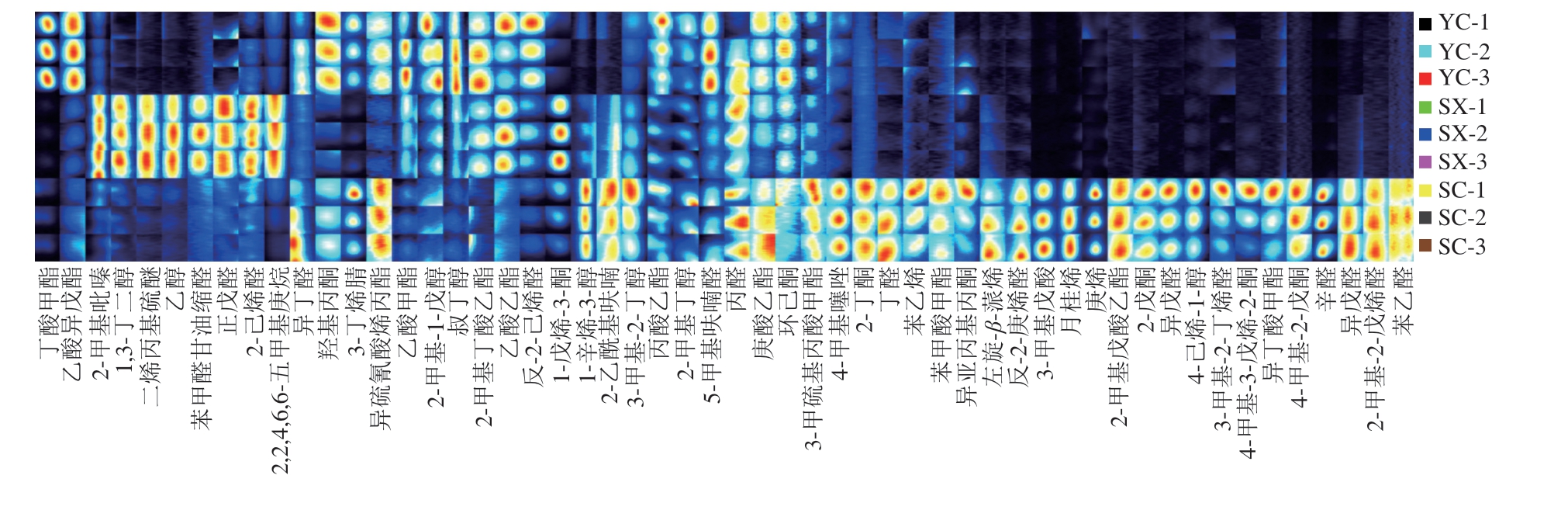 由表4可知,3 种样品共鉴定出54 种化合物,包括15 种醛类、11 种酯类、9 种醇类、8 种酮类、5 种烷烃类、1 种酸类、1 种醚类和4 种其他化合物,其中YC、SX、SC分别检出24、28、44 种。在挥发性物质指纹图谱中,点的颜色越深,说明该物质的含量越高。由图4可知,酱腌腊肉和烟熏腊肉的挥发性化合物种类存在差异。腊肉含有的挥发性化合物和原材料的脂肪含量及其氧化状态和工艺条件的差异有关[19]。