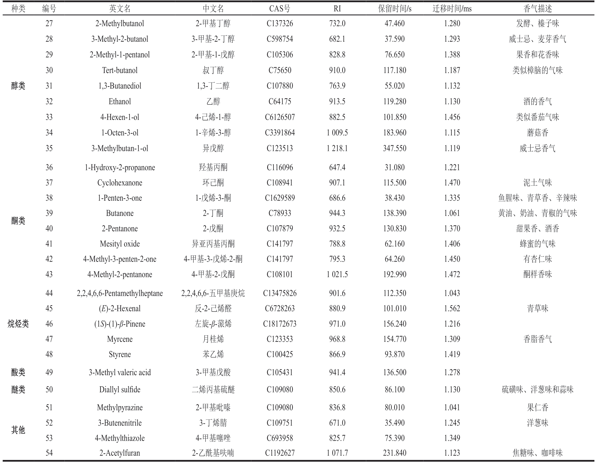 种类编号英文名中文名CAS号RI保留时间/s迁移时间/ms香气描述醇类272-Methylbutanol2-甲基丁醇C137326732.047.4601.280发酵、榛子味283-Methyl-2-butanol3-甲基-2-丁醇C598754682.137.5901.293威士忌、麦芽香气292-Methyl-1-pentanol2-甲基-1-戊醇C105306828.876.6501.388果香和花香味30Tert-butanol叔丁醇C75650910.0117.1801.187类似樟脑的气味311,3-Butanediol1,3-丁二醇C107880763.955.0201.132 32Ethanol乙醇C64175913.5119.2801.130酒的香气334-Hexen-1-ol4-己烯-1-醇C6126507882.5101.8501.456类似番茄气味341-Octen-3-ol1-辛烯-3-醇C33918641 009.5183.9601.115蘑菇香353-Methylbutan-1-ol异戊醇C1235131 218.1347.5501.119威士忌香气酮类361-Hydroxy-2-propanone羟基丙酮C116096647.431.0801.221 37Cyclohexanone环己酮C108941907.1115.5001.470泥土气味381-Penten-3-one1-戊烯-3-酮C1629589686.638.4301.335鱼腥味、青草香、辛辣味39Butanone2-丁酮C78933944.3138.3901.061黄油、奶油、青椒的气味402-Pentanone2-戊酮C107879932.5130.8301.370甜果香、酒香41Mesityl oxide异亚丙基丙酮C141797788.862.1601.406蜂蜜的气味424-Methyl-3-penten-2-one4-甲基-3-戊烯-2-酮C141797795.364.2601.450有杏仁味434-Methyl-2-pentanone4-甲基-2-戊酮C1081011 021.5192.9901.472酮样香味烷烃类442,2,4,6,6-Pentamethylheptane2,2,4,6,6-五甲基庚烷C13475826901.6112.3501.043 45(E)-2-Hexenal反-2-己烯醛C6728263880.9101.0101.562青草味46(1S)-(1)-β-Pinene左旋-β-蒎烯C18172673971.0156.2401.216 47Myrcene月桂烯C123353968.8154.7701.309香脂香气48Styrene苯乙烯C100425866.993.8701.419酸类493-Methyl valeric acid3-甲基戊酸C105431941.4136.5001.278醚类50Diallyl sulfide二烯丙基硫醚C109080850.686.1001.130硫磺味、洋葱味和蒜味其他51Methylpyrazine2-甲基吡嗪C109080836.880.0101.041果仁香523-Butenenitrile3-丁烯腈C109751671.035.4901.245洋葱味534-Methylthiazole4-甲基噻唑C693958825.775.3901.349 542-Acetylfuran2-乙酰基呋喃C11926271 071.7231.8401.123焦糖味、咖啡味