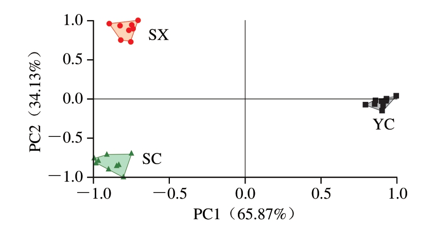 对电子鼻结果进行主成分分析(principal component analysis,PCA),由图2可知,PC1和PC2的贡献率分别为65.87%和34.13%,累计贡献率超过90%,说明这2 个PC可以很好地反映样品的气味差异。YC、SX和SC均分布在不同的区域且没有重叠,表明电子鼻能较好地区分3 组样品,说明酱腌腊肉和烟熏腊肉具有不同的气味轮廓。电子鼻结果产生差异的原因:腊肉中含有的挥发性风味物质和含量不同,因此电子鼻的响应值具有差异。可能与腊肉的腌制方式、腌制温度、湿度、时间、干燥方式、温度、时间等条件有关。不同的加工方式和条件会导致腊肉中挥发性化合物的种类和含量发生变化,从而在电子鼻检测中产生不同的响应。