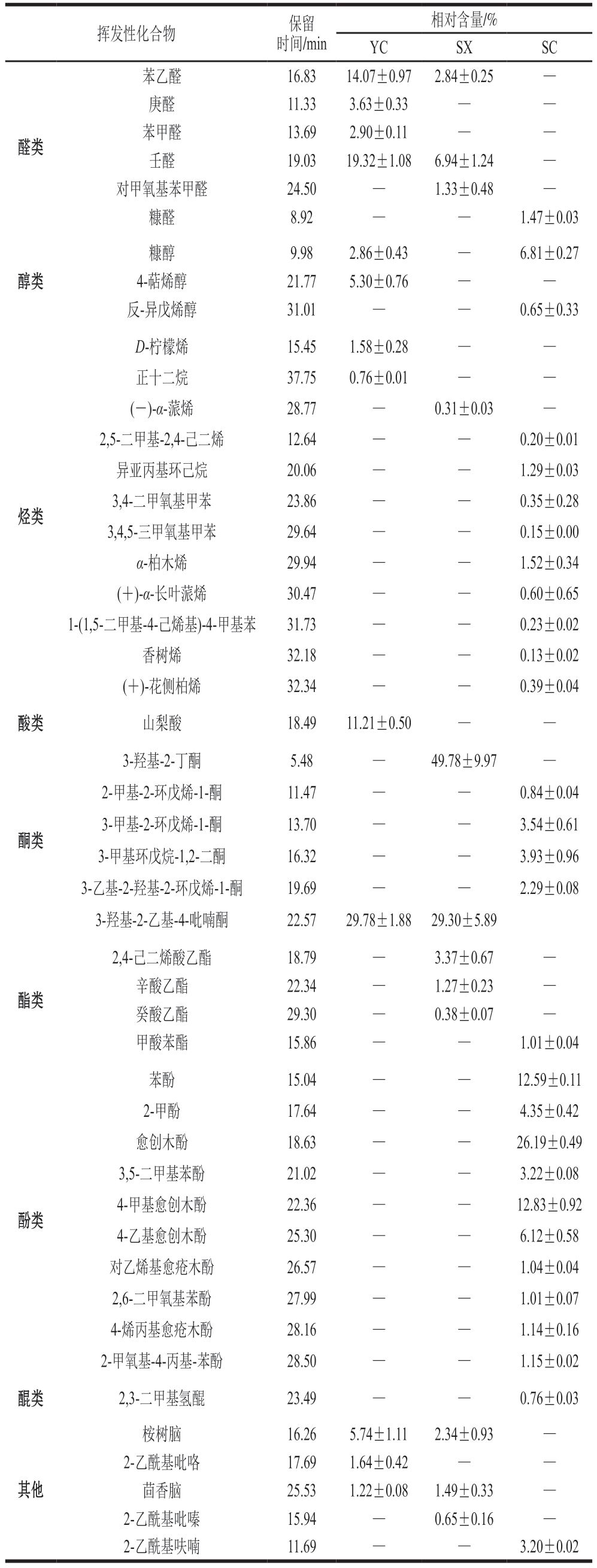 由表5可知,3 组样品中共检出48 种挥发性化合物,包括6 种醛类、3 种醇类、12 种烃类、1 种酸类、6 种酮类、4 种酯类、10 种酚类、1 种醌类和5 种其他化合物,不同样品的挥发性风味物质种类及相对含量具有差异。其中,YC、SX、SC分别鉴定出13、12、29 种挥发性化合物,说明烟熏可赋予腊肉更多的风味化合物。