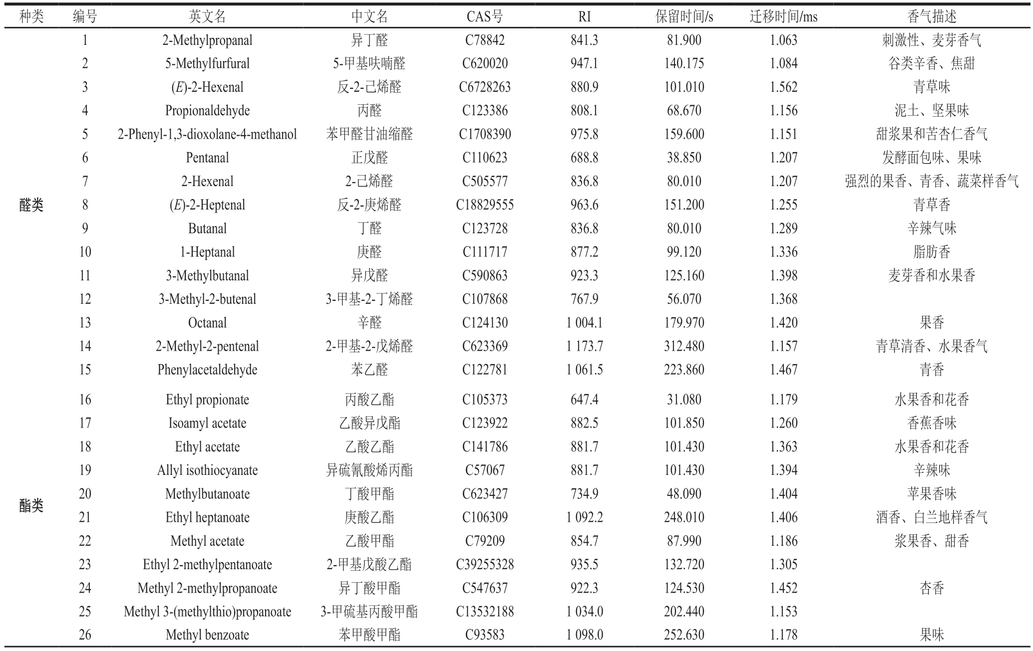 种类编号英文名中文名CAS号RI保留时间/s迁移时间/ms香气描述2-Methylpropanal异丁醛C78842841.381.9001.063刺激性、麦芽香气2 5-Methylfurfural5-甲基呋喃醛C620020947.1140.1751.084谷类辛香、焦甜3(E)-2-Hexenal反-2-己烯醛C6728263880.9101.0101.562青草味4 Propionaldehyde丙醛C123386808.168.6701.156泥土、坚果味52-Phenyl-1,3-dioxolane-4-methanol苯甲醛甘油缩醛C1708390975.8159.6001.151甜浆果和苦杏仁香气6 Pentanal正戊醛C110623688.838.8501.207发酵面包味、果味7 1醛类2-Hexenal2-己烯醛C505577836.880.0101.207强烈的果香、青香、蔬菜样香气8(E)-2-Heptenal反-2-庚烯醛C18829555963.6151.2001.255青草香9 Butanal丁醛C123728836.880.0101.289辛辣气味101-Heptanal庚醛C111717877.299.1201.336脂肪香113-Methylbutanal异戊醛C590863923.3125.1601.398麦芽香和水果香123-Methyl-2-butenal3-甲基-2-丁烯醛C107868767.956.0701.368 13Octanal辛醛C1241301 004.1179.9701.420果香142-Methyl-2-pentenal2-甲基-2-戊烯醛C6233691 173.7312.4801.157青草清香、水果香气15Phenylacetaldehyde苯乙醛C1227811 061.5223.8601.467青香酯类16Ethyl propionate丙酸乙酯C105373647.431.0801.179水果香和花香17Isoamyl acetate乙酸异戊酯C123922882.5101.8501.260香蕉香味18Ethyl acetate乙酸乙酯C141786881.7101.4301.363水果香和花香19Allyl isothiocyanate异硫氰酸烯丙酯C57067881.7101.4301.394辛辣味20Methylbutanoate丁酸甲酯C623427734.948.0901.404苹果香味21Ethyl heptanoate庚酸乙酯C1063091 092.2248.0101.406酒香、白兰地样香气22Methyl acetate乙酸甲酯C79209854.787.9901.186浆果香、甜香23Ethyl 2-methylpentanoate2-甲基戊酸乙酯C39255328935.5132.7201.305 24Methyl 2-methylpropanoate异丁酸甲酯C547637922.3124.5301.452杏香25Methyl 3-(methylthio)propanoate3-甲硫基丙酸甲酯C135321881 034.0202.4401.153 26Methyl benzoate苯甲酸甲酯C935831 098.0252.6301.178果味