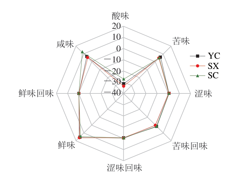 感官评价是评价腊肉品质的重要指标之一,由表3和图1可知,SX的总体接受度最高;在色泽、滋味方面,SC感官评分明显高于YC和SX;3 个样品的组织形态评分差异较小;SX和SC的气味评分差异较小;YC的各项感官评分均低于其他2 个样品,但3 个样品的总体可接受度评分差异不显著。