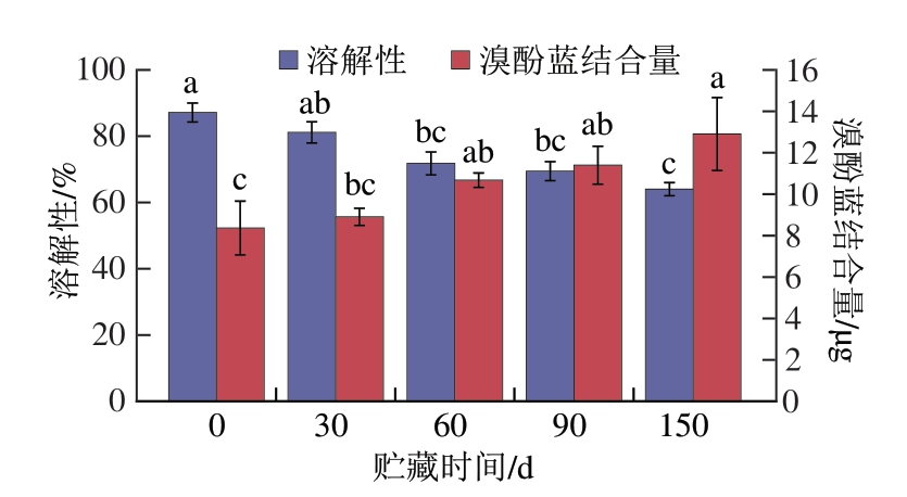 因此,本研究以骆驼肉MP为研究对象,探究冷冻贮藏(-20 ℃)时间(0、30、60、90、150 d)对骆驼肉MP的影响,通过测定不同的MP指标(溶解性、表面疏水性、羰基含量、总巯基含量、活性巯基含量、二级结构、Zeta电位、平均粒径、十二烷基硫酸钠-聚丙烯酰胺凝胶电泳(sodium dodecyl sulfate polyacrylamide gel electropheresis,SDS-PAGE))和MP凝胶指标(色泽、保水性和微观结构),以探究骆驼肉MP在冷冻条件下的变化规律。本研究可为延长骆驼肉冷冻贮藏货架期和改善骆驼肉加工性能提供理论参考依据。