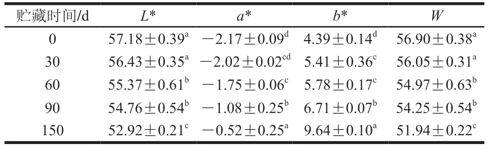 贮藏时间/dL*a*b*W 057.18±0.39a -2.17±0.09d 4.39±0.14d 56.90±0.38a 3056.43±0.35a -2.02±0.02cd 5.41±0.36c 56.05±0.31a 6055.37±0.61b -1.75±0.06c 5.78±0.17c 54.97±0.63b 9054.76±0.54b -1.08±0.25b 6.71±0.07b 54.25±0.54b 15052.92±0.21c -0.52±0.25a 9.64±0.10a 51.94±0.22c