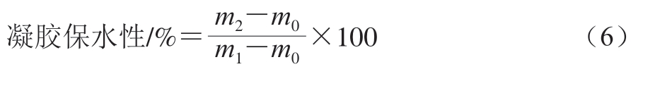 参照Chen Zhaohui等[18]的方法。准确称取离心管的质量(m0/g)。将10 g样品放入50 mL试管中,记录离心管和凝胶的总质量(m1/g),在4 ℃下6 000×g离心20 min。除去水分,准确称量装有样品的离心管质量(m2/g)。凝胶保水性按式(6)计算: