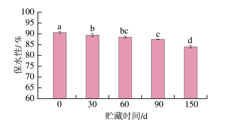 MP凝胶通过三维网络结构赋予肉制品弹性、硬度和咀嚼性。保水性是评估蛋白质凝胶功能特性的重要指标,其变化反映了蛋白质贮藏过程中的结构稳定性和持水能力。如图7所示,随着贮藏时间的延长,骆驼肉MP凝胶的保水性由0 d的(90.60±0.48)%显著下降至150 d的(83.99±0.57)%(P<0.05)。如图8所示,MP凝胶在0 d时结构较为均匀且致密,表面光滑,随着贮藏的进行,MP凝胶出现更多的孔隙和裂缝,整体结构变得不规则,贮藏150 d时,MP凝胶已经出现较大的孔隙。这与Zhang Huiyun等[19]对猪肉MP凝胶的研究结果相同。