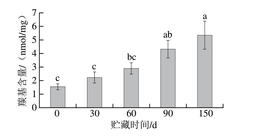 图2 骆驼肉MP羰基含量在冷冻贮藏期间的变化