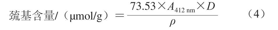 活性巯基含量测定:取5.5 mL样品(1 mg/mL)与100 μL Ellman试剂振荡混匀,混合溶液在4 ℃下静置1 h。取适量样品放置在光程为10 mm的比色皿中,在紫外分光光度计中于412 nm处测定样品吸光度。使用磷酸盐缓冲液作为空白对照,各处理组进行3 次平行测定。巯基含量按式(4)计算: