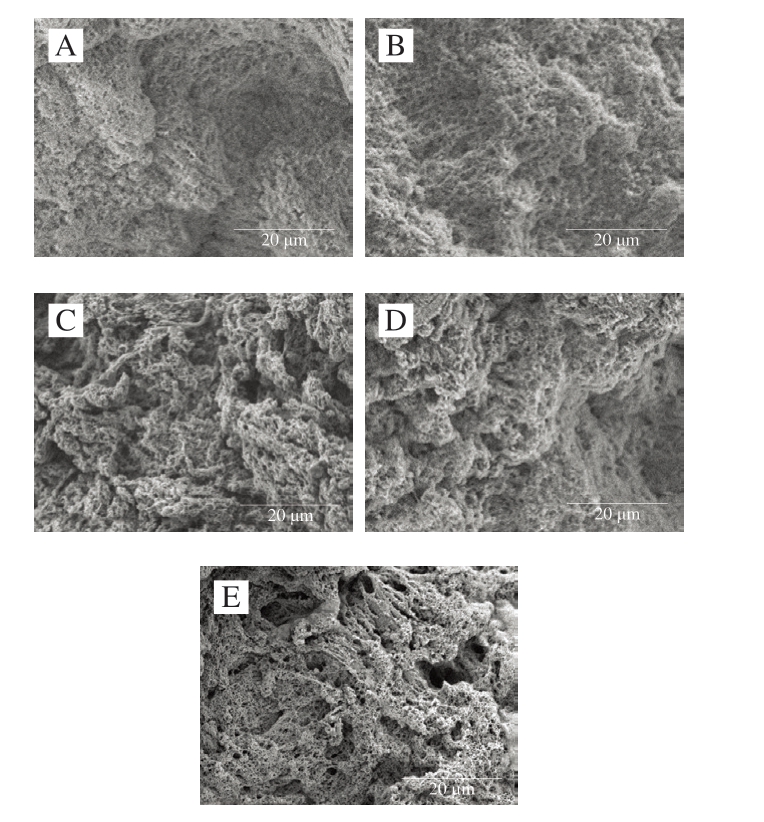 从MP凝胶中心区域切下3 mm×3 mm×3 mm的立方体放入质量分数2.5%的戊二醇溶液中,在4 ℃冰箱中过夜,取出后用0.1 mol/L的磷酸缓冲液(pH 7.0)漂洗3 次,每次15 min,以洗去戊二醇;再依次用体积分数30%、50%、70%、80%、90%的乙醇进行梯度脱水,每次15 min,最后再使用无水乙醇脱水30 min,每次脱水时在摇床上进行振荡。将脱水后的样品进行冷冻干燥,镀膜后置于电子显微镜下观察。放大倍数2 000 倍,电压5 kV。