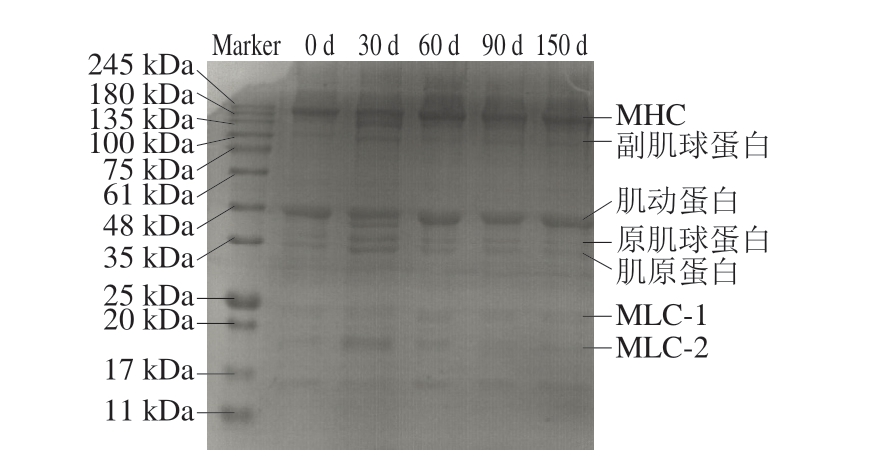 可以发现,骆驼肉MP贮藏30 d以后在30 kDa处出现新条带,同时条带数在30 d时达到最多,随后逐渐变淡,此处条带可能是肌钙蛋白T(35 kDa)降解后产生的多肽;与贮藏30 d相比,贮藏中后期(60~150 d)的MLC和肌原蛋白条带逐渐变淡,与0 d相比,150 d的MHC条带较宽,这一方面可能是由于半胱氨酸侧链的硫原子被氧化形成二硫键(—S—S—),促使蛋白质分子之间或内部发生交联和聚集,同时大分子质量蛋白质的条带结合了更多的染色剂,从而使小分子蛋白质条带较淡,另一方面可能是多肽进一步降解为氨基酸,杜琪等[39]也发现冷藏期间的细点圆趾蟹MP有大分子聚集的情况。