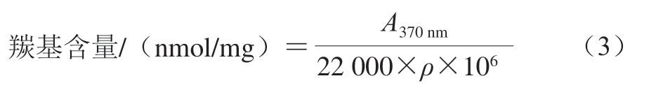 参照Oliver等[15]的方法。将MP样品稀释至5 mg/mL,分别取2 份于离心管中,其中1 份加入1 600 μL 2 mol/L HCl溶液(含0.002 g/mL 2,4-二硝基苯肼),记为处理组;另1 份加入1 600 μL 2 mol/L HCl溶液,记为空白组。将处理组和空白组溶液在室温下反应30 min后,加入800 μL 0.4 g/mL TCA溶液沉淀蛋白质,4 ℃、8 700×g离心15 min,去除上清液。然后加入2 mL乙醇-乙酸乙酯混合液(1∶1,V/V)洗涤3 次以除去未反应的2,4-二硝基苯肼,加入3 mL磷酸盐缓冲液(20 mmol/L,pH 6.5,含6 mol/L盐酸胍)溶解沉淀。放置过夜后,于370 nm处测定吸光度。羰基含量按式(3)计算: