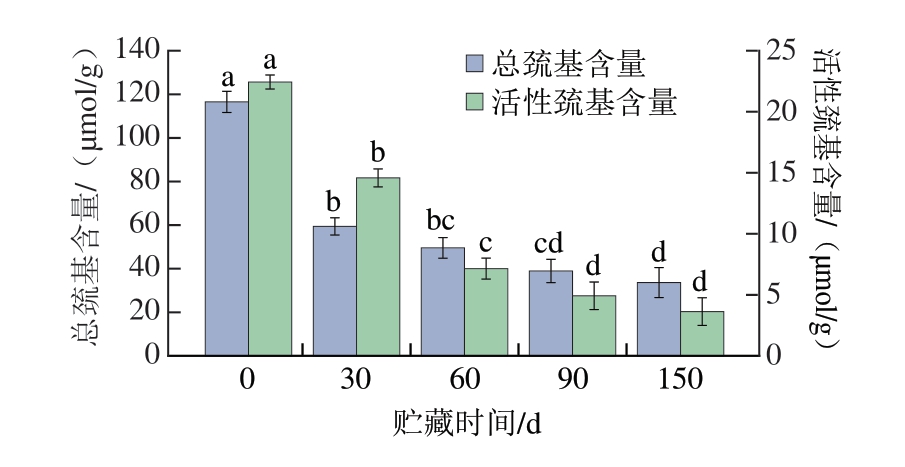巯基是半胱氨酸残基侧链上的基团,是一种亲水基团,半胱氨酸的巯基活性较强,是MP中活性最强的基团[28],MP中的总巯基包括其表面的活性巯基和深埋于分子内部的巯基,当蛋白质变性展开,埋在蛋白内部的巯基暴露到表面,就成为了活性巯基。如图3所示,随着贮藏时间的延长,骆驼肉MP的总巯基含量和活性巯基含量分别由0 d的(116.51±4.84)、(22.45±0.56)μmol/g显著下降至150 d的(33.65±6.87)、(3.63±1.13)μmol/g(P<0.05),骆驼肉MP初始总巯基含量略低于猪肉MP((125.27±3.63)nmol/g),活性巯基含量高于猪肉MP((13.68±0.40)nmol/g)[29],这与Nguyen等[30]对相同贮藏条件下的鳕鱼研究结果相同,表明长期的冷冻贮藏导致MP结构破坏和功能丧失。这种变化的原因可能与冷冻贮藏过程中MP的氧化和聚集有关。巯基氧化会造成多肽间形成二硫键和磺酸类等氧化产物,从而导致蛋白质分子间产生交联、聚合,同时巯基含量的变化也会引起MP空间结构的改变及MP溶解性的降低[31]。同时,低温会导致肌球蛋白聚集,致使盐溶性蛋白被氧化[32]。