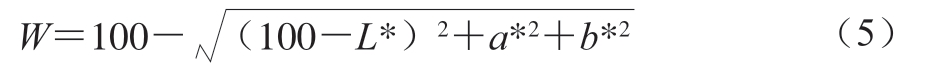 使用标准白板和黑板校准色差仪,用滤纸拭干凝胶表面的水分后,测定凝胶表面的亮度值(L*)、红度值(a*)和黄度值(b*),白度(W)按式(5)计算: