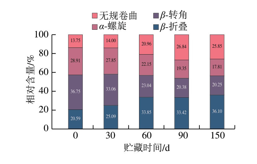 Fig.4 Changes in the relative contents of secondary structure of camel meat MP during frozen storage