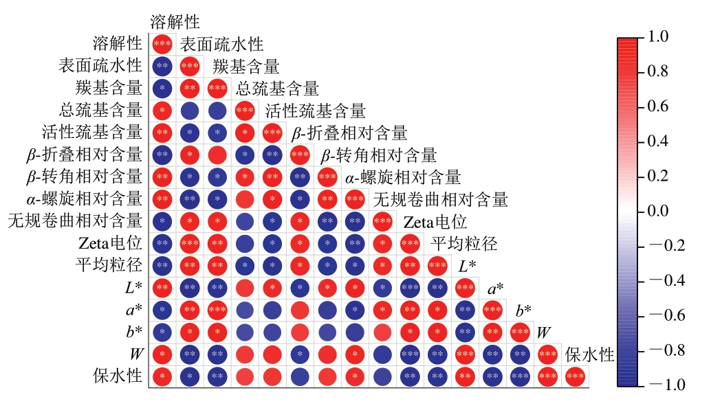MP凝胶中,W与L*、保水性均呈高度显著正相关(P<0.001),a*和b*呈极显著正相关(P<0.01),L*和a*、b*均呈极显著负相关(P<0.01)。从W计算公式可知,W由L*主导,高W意味着高反射率,即光滑致密的凝胶网状结构也就意味着高保水性。MP氧化产物的累积推动a*和b*的同步上升及L*的下降。