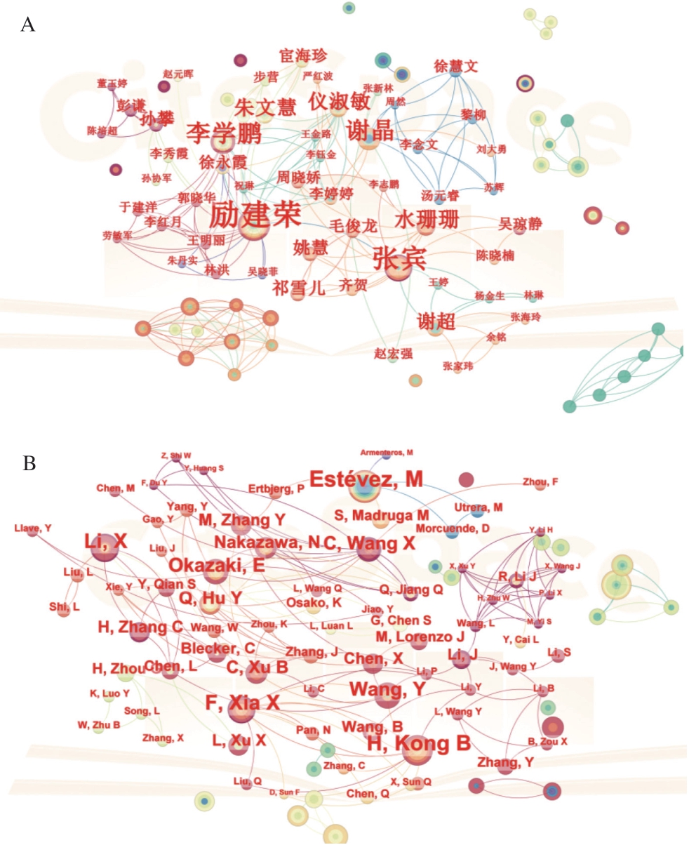 Fig.6 Collaboration diagrams of authors engaged in frozen meat research in the Wanfang (A) and WOS databases (B)
