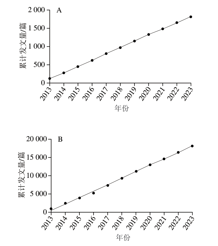 本研究采用CiteSpace 6.3.1作为主要分析工具,结合文献计量在线分析平台(https://bibliometric.com)及Microsoft Excel(Microsoft Office套件的一部分)进行辅助分析[11-12]。利用CiteSpace和文献计量在线分析平台[13]进行可视化分析[14-19]。采用NoteExpress(北京爱琴海软件有限公司)进行必要的数据格式转换[20-21]。