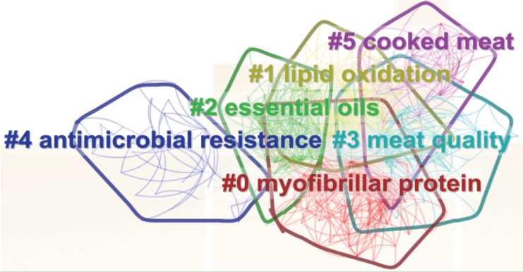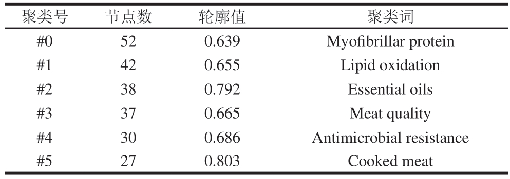 聚类号节点数轮廓值聚类词#0520.639Myofibrillar protein#1420.655Lipid oxidation#2380.792Essential oils#3370.665Meat quality#4300.686Antimicrobial resistance#5270.803Cooked meat