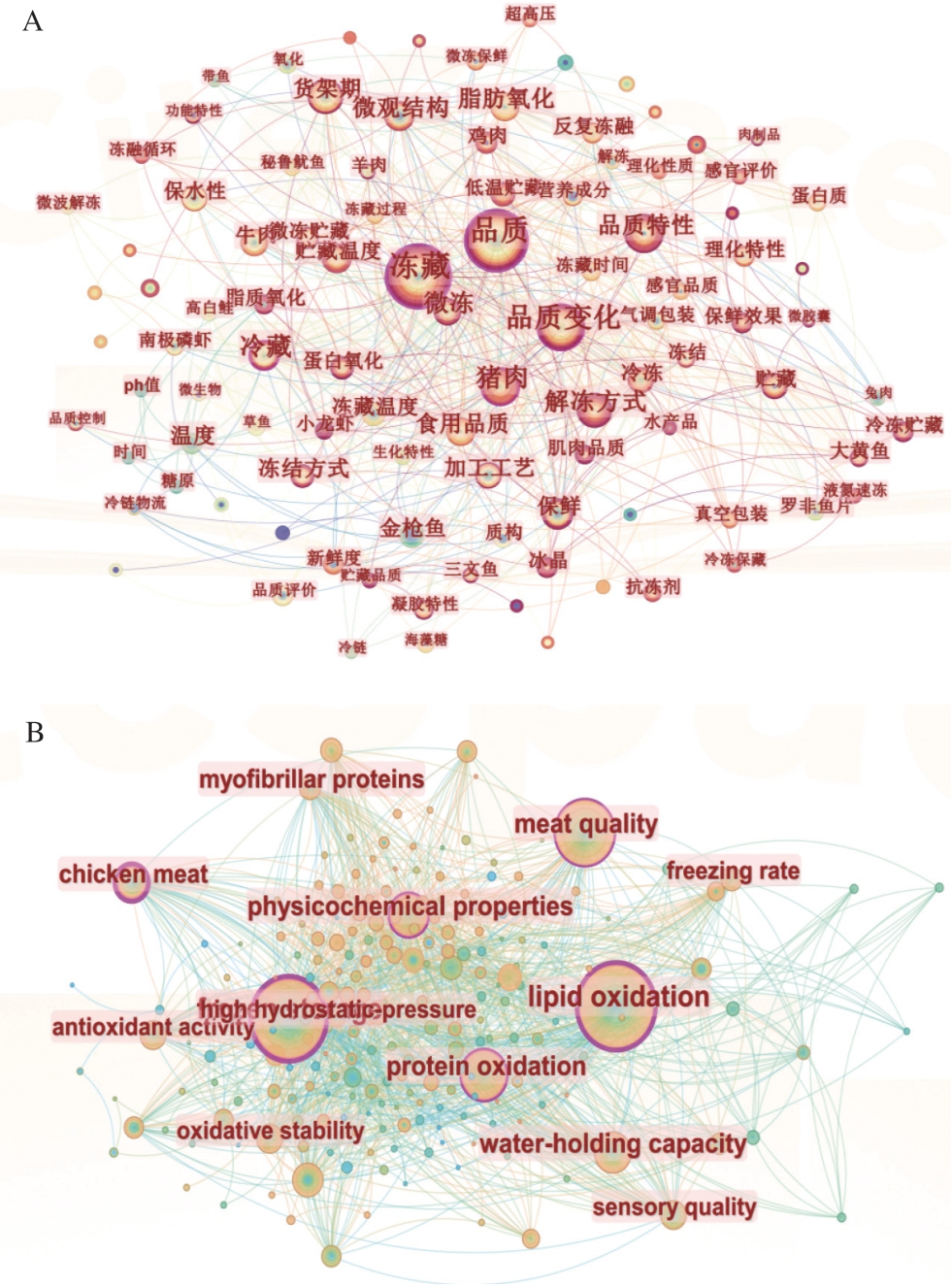Fig.7 Co-occurrence maps of keywords in frozen meat research in the Wanfang (A) and WOS databases (B)