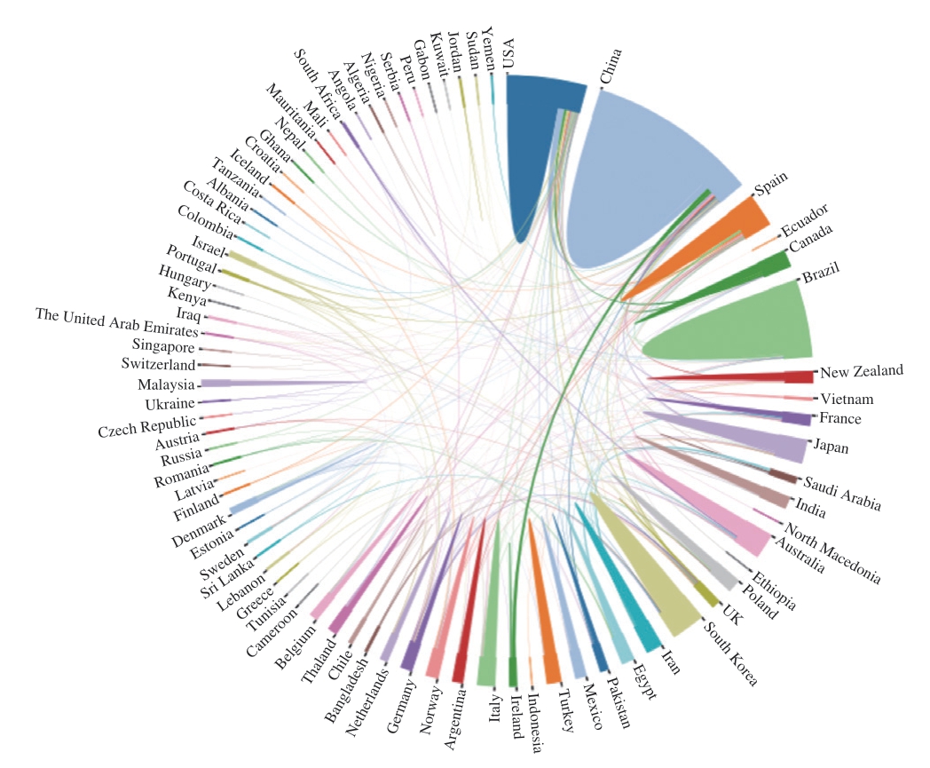 由图4可知,以中国、美国、西班牙等国家为核心,与其他各国建立了良好的合作关系,形成了一张较大的合作网络图[25],主力国家之间合作密切,其他国家之间的合作有待加强。