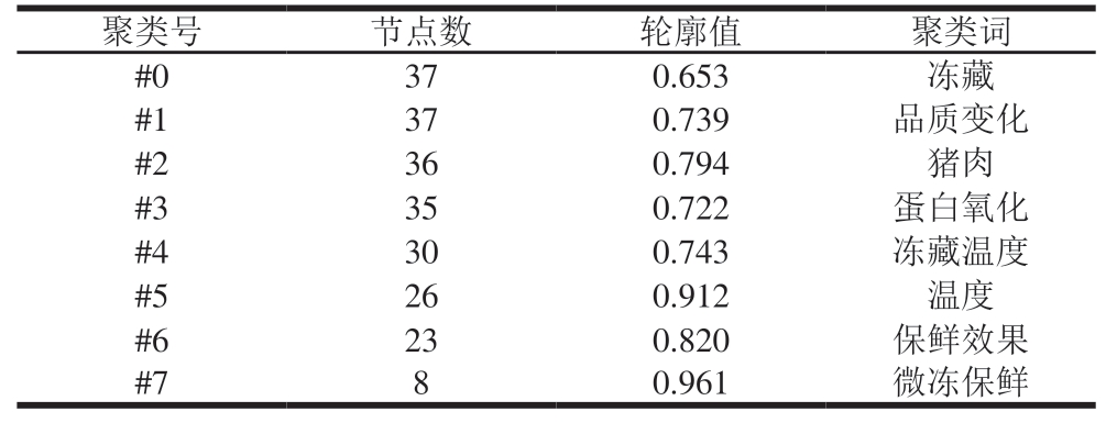 聚类号节点数轮廓值聚类词#0370.653冻藏#1370.739品质变化#2360.794猪肉#3350.722蛋白氧化#4300.743冻藏温度#5260.912温度#6230.820保鲜效果#780.961微冻保鲜
