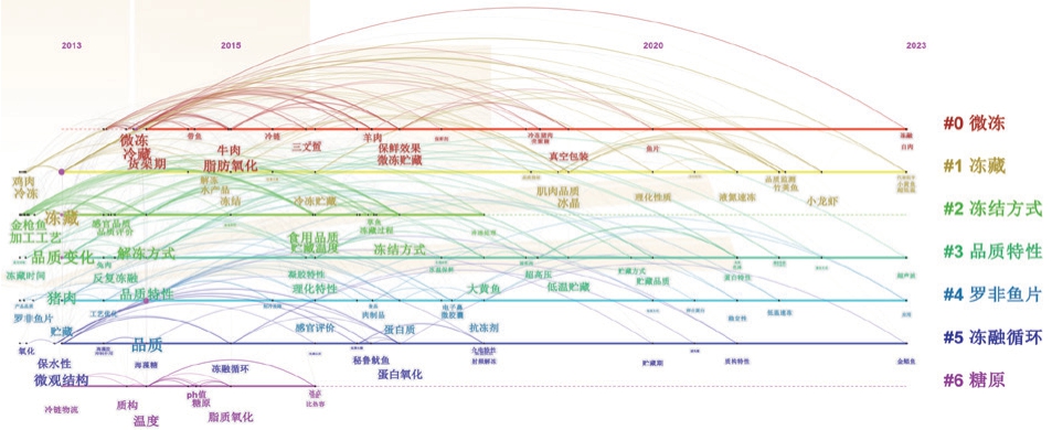 为更好地分析出冻藏肉制品研究主题及其随时间的变化趋势,基于关键词聚类结果绘制时间线图[36-37],如图9所示,按3 个时间段进行分析。