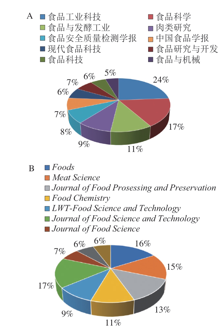 Fig.3 Top 10 journals with the highest publication volume of frozen meat research in the Wanfang (A) and WOS databases (B)