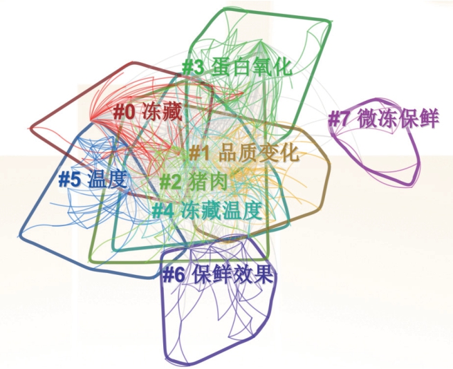 基于关键词共现图谱对关键词进行聚类分析[34],聚类效果以图谱模块值(Q)和平均轮廓值(S)为评价标准:Q>0.3表明聚类显著,S>0.5表明聚类合理,S>0.7表明聚类具有较高可信度[35]。中文文献关键词聚类图谱如图8所示。中文文献关键词共形成8 个聚类结果,如表2所示。Q=0.417 5>0.4,表明聚类网络结构合理,S=0.767 0>0.7,表明聚类结果可信,聚类结果有明确的主题。关键词聚类图显示各研究方向之间存在交叉。聚类结果呈现递进关系,早期关注冻藏温度(#4冻藏温度、#5温度)对肉类品质的影响(#1品质变化)及基于工艺改善肉类品质;随着科技的发展,逐渐转向研究肉中成分(#3蛋白氧化)变化;近年来已深入到微观层面的研究。