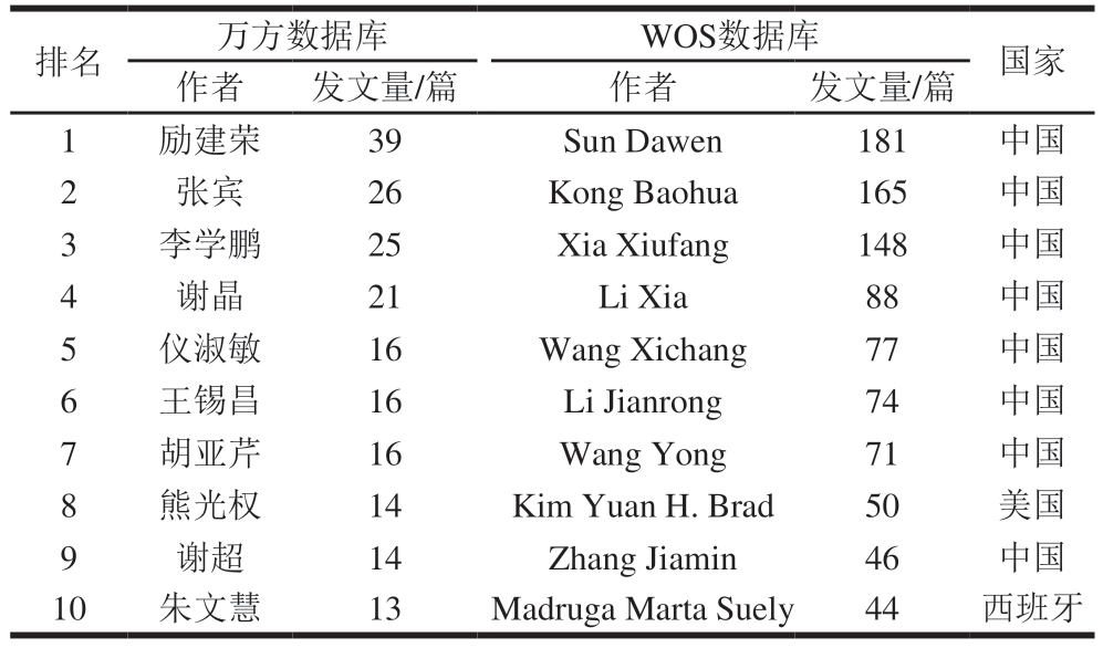 Table 1 Top 10 most prolific authors of frozen meat research in the Wanfang and WOS databases