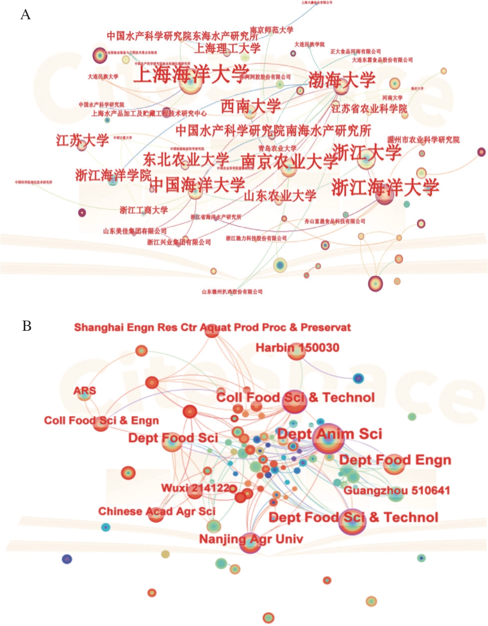 Fig.5 Inter-institution collaboration networks of frozen meat research in the Wanfang (A) and WOS databases (B)