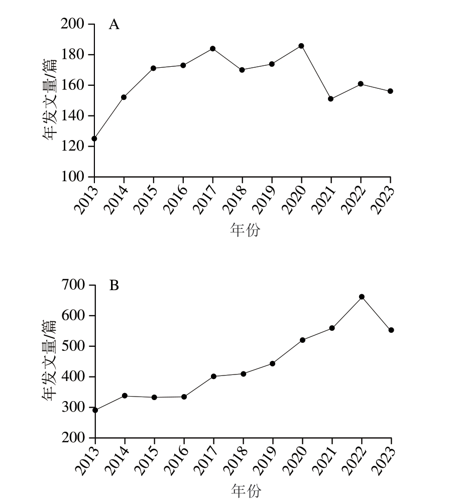 Fig.1 Annual number of research papers on frozen meat indexed in the Wanfang (A) and WOS databases (B)