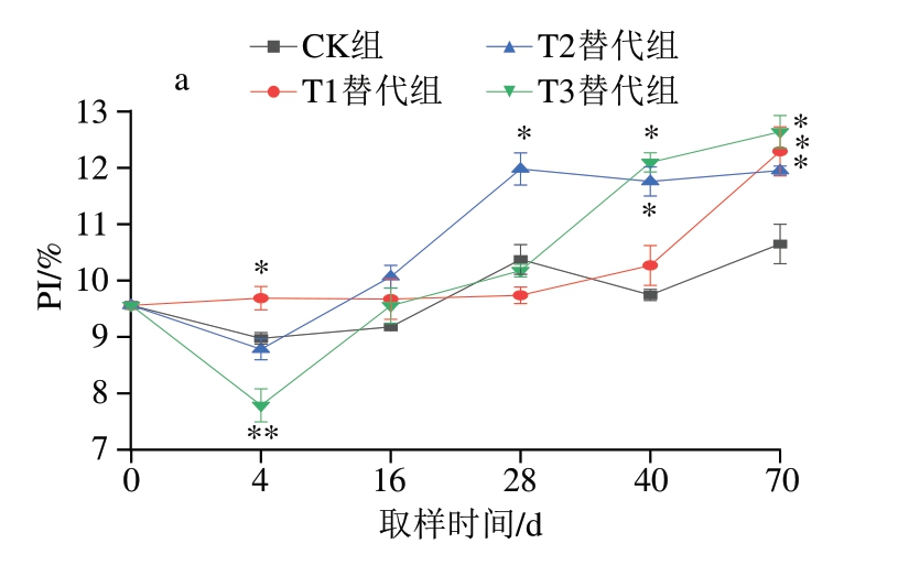 蛋白质降解是传统干腌肉制品加工过程中重要的生化反应,也是肽和游离氨基酸形成的关键过程[31]。PI是评价蛋白质降解程度的重要参考指标[18]。如图2a所示,CK组PI在9%~11%之间波动,随着成熟时间的延长,肉块的PI增加趋势逐渐平缓。3 个替代组从成熟开始,与CK组逐渐出现显著差异(P<0.05),说明在成熟及后熟阶段,替代组的肌肉蛋白质降解程度更高。在后熟结束时,T1、T2和T3替代组的PI分别为12.29%、11.95%和12.64%,均显著高于CK组(P<0.05),表明此阶段还具有强烈的蛋白质降解反应。前期研究[25]发现,金华火腿在后熟阶段也进行着强烈的蛋白质降解反应,可能是由于后熟阶段会有一定的霉菌生长,霉菌生长产生的蛋白酶可能参与后熟期间进行的蛋白质降解反应,从而发生蛋白质持续降解的现象。
