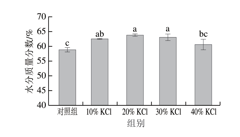 如图4所示,10%、20%、30% KCl替代组酸肉水分含量显著高于对照组(P<0.05),40% KCl替代组水分含量和对照组无显著差异,且随着KCl替代比例增加,水分含量变化呈先上升后下降趋势,20% KCl替代组出现峰值(63.8%)。这可能是由于K+的电荷密度高于Na+,因此K+的扩散速率大于Na+[33],随着KCl替代比例升高至20%,此时酸肉中同时存在K+、Na+、Cl- 3 种离子,使酸肉吸水能力增强,表现为酸肉水分含量升高。随着KCl替代比例继续升高,酸肉中K+的浓度也逐渐升高,而K+会率先与肌肉表面的蛋白质结合,引起肌肉收缩,进而阻碍Na+和Cl-的渗透[34],而Na+和Cl-具有较强的吸引水分子的能力,在保持Cl-水平的情况下,减少Na+作用,吸水能力降低,表现为酸肉水分含量降低。