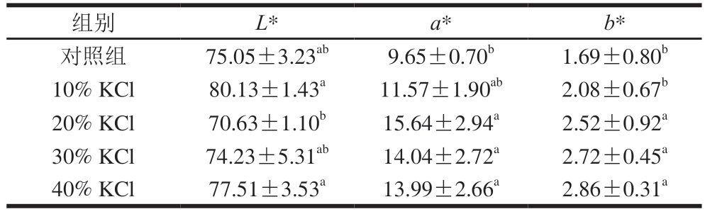 组别L*a*b*对照组75.05±3.23ab9.65±0.70b1.69±0.80b 10% KCl80.13±1.43a11.57±1.90ab2.08±0.67b 20% KCl70.63±1.10b15.64±2.94a2.52±0.92a 30% KCl74.23±5.31ab14.04±2.72a2.72±0.45a 40% KCl77.51±3.53a13.99±2.66a2.86±0.31a