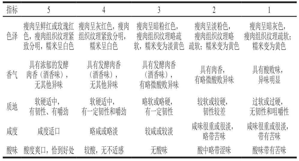 参考吴春霞等[13]的方法,并稍作修改。邀请10 位具有食品专业基础的人员(年龄在20~35 岁之间)担任评分员,对评分员开展3 次培训,使评分员熟悉酸肉样品特性,并对各评定指标和标准开展讨论并达成共识,形成酸肉的评价标准(表1),质量级分为5 个等级,分别为优级、良好、一般、合格、较差,依次赋予分值5、4、3、2、1。感官综合评分=色泽评分×20%+香气评分×20%+质地评分×20%+咸度评分×20%+酸味评分×20%,感官评分4~5表示品质优,可接受性高,2~3表示样品尚可接受,低于2则不能接受。将酸肉样品瘦肉部分切分为1 cm3大小,在煮沸的蒸锅中蒸制30 min后,放置于随机3 位数字编号的透明杯中,随机分发给评分员,评分员在进行评价时不得相互交谈,更换样品时用纯水漱口。