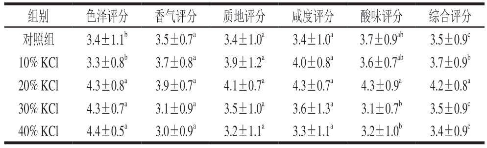 组别色泽评分香气评分质地评分咸度评分酸味评分综合评分对照组3.4±1.1b3.5±0.7a3.4±1.0a3.4±1.0a3.7±0.9ab3.5±0.9c 10% KCl3.3±0.8b3.7±0.8a3.9±1.2a4.0±0.8a3.6±0.7ab3.7±0.9b 20% KCl4.3±0.8a3.9±0.7a4.1±0.7a4.3±0.7a4.3±0.9a4.2±0.8a 30% KCl4.3±0.7a3.1±0.9a3.5±1.0a3.6±1.3a3.1±0.7b3.5±0.9c 40% KCl4.4±0.5a3.0±0.9a3.2±1.1a3.3±1.1a3.2±1.0b3.4±0.9c