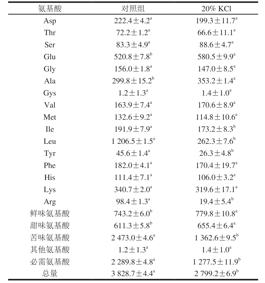 氨基酸对照组20% KCl Asp222.4±4.2a199.3±11.7a Thr72.2±1.2a66.6±11.1a Ser83.3±4.9a88.6±4.7a Glu520.8±7.8b580.5±9.9a Gly156.0±1.8a147.0±8.5a Ala299.8±15.2b353.2±1.4a Gys1.2±1.3a1.4±1.0a Val163.9±7.4a170.6±8.9a Met132.6±9.2a114.8±10.6a Ile191.9±7.9a173.2±8.3b Leu1 206.5±1.5a262.3±7.6b Tyr45.6±1.4a26.3±4.8b Phe182.0±4.1a170.4±19.7a His111.4±a106.0±3.2a Lys340.7±2.0319.6±17.1a Arg98.4±1.3a19.4±5.4b鲜味氨基酸743.2±6.0b779.8±10.8a甜味氨基酸611.3±5.8b655.4±6.4a苦味氨基酸2 473.0±4.6a1 362.6±9.5b其他氨基酸1.2±1.3a1.4±1.0a必需氨基酸2 289.8±4.8a1 277.5±11.9b总量3 828.7±4.4a2 799.2±6.9b