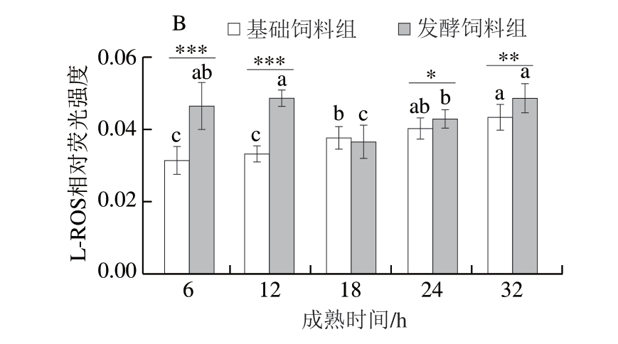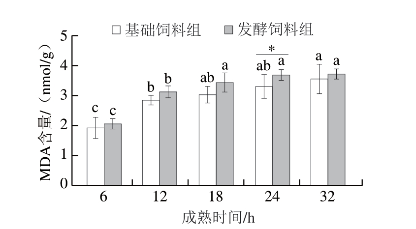 脂质过氧化水平是评估铁死亡进程的重要生物学指标[26]。其核心机制在于:L-ROS与细胞脂质膜PUFA相互作用时,经初级氧化和次级氧化产生MDA等多种氧化产物[27]。由图4可知,随着成熟时间的延长,基础饲料组和发酵饲料组MDA含量均呈现显著上升趋势(P<0.05)。其中,发酵饲料组MDA含量在整个成熟期内始终高于基础饲料组,且在24 h时表现出显著水平(P<0.05)。这与L-ROS含量结果较为一致。