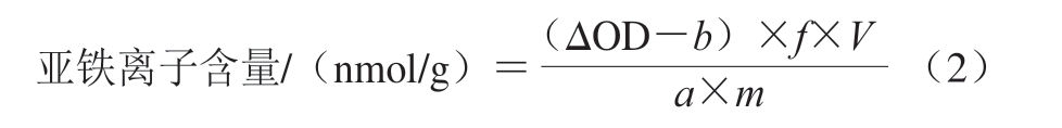 采用亚铁离子比色法检测试剂盒测定鸡胸肉样品中的亚铁离子含量,参照试剂盒说明书并作适当修改。按匀浆液质量的9%加入鸡胸肉组织,4 ℃、12 000×g离心10 min,取上清。以标准品为空白对照,分别向300 µL样品、标准品中加入150 µL工作液,37 ℃孵育10 min,再次离心并取300 µL上清液,593 nm波长处测定光密度(optical density,OD)。亚铁离子含量(以组织湿质量计算)按式(2)计算: